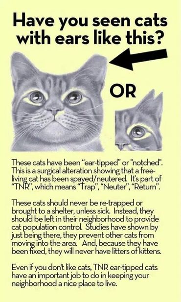Trap-Neuter-Return, or "TNR," is the most humane and effective method known for managing feral and stray cats and reducing their numbers. The cats, who typically live together in a group called a colony, are trapped and brought to a veterinary clinic. They're then spayed or neutered, vaccinated for rabies where appropriate and ear-tipped. After they've recovered from their surgeries, the cats are returned back to their original territory where a caretaker provides regular food and shelter. When foster or permanent homes are available, young kittens and friendly adults are removed and placed for adoption.